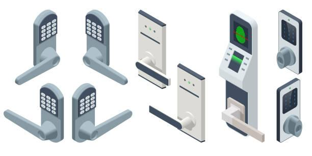 Alt text: Isometric illustrations of some electronic access control systems for doors